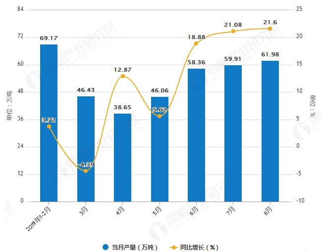 據國家統計局統計數據顯示,2019年1-2季度湖南省飲料產量有所增長,2019年7月湖南省飲料產量為59.91萬噸,同比增長21.08%。2019年1-8月湖南省飲料產量為426.01萬噸,同比增長20.76%。
