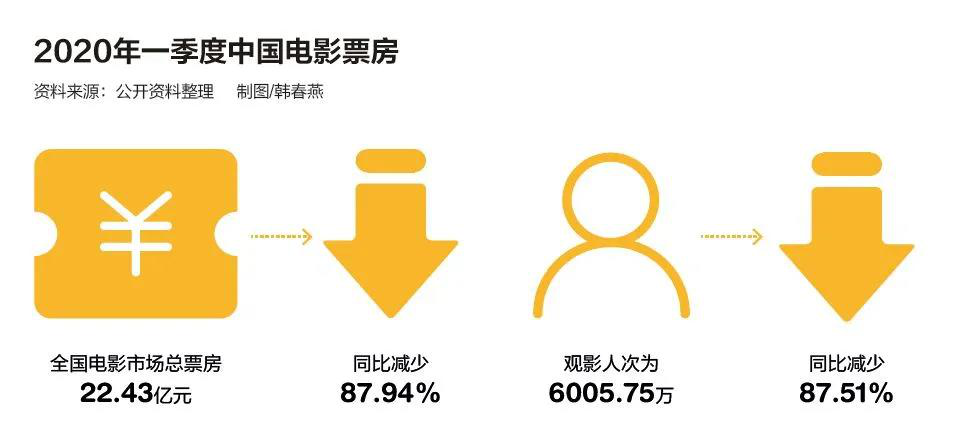藝恩數據顯示,2020年一季度,全國電影市場總票房22.43億元,同比減少87.94%;觀影人次為6005.75萬,同比減少87.51%。電影票房和觀影人次的暴跌,使得包括影視制作公司、宣傳發行公司、院線公司在內的整個電影行業都不景氣。